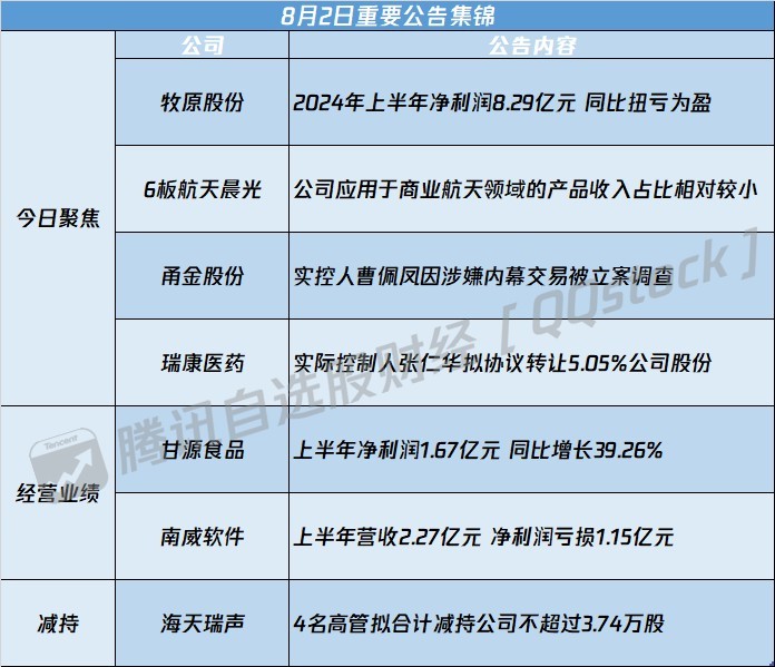 1、牧原股份:2024年上半年净利润8.29亿元 同比扭亏为盈