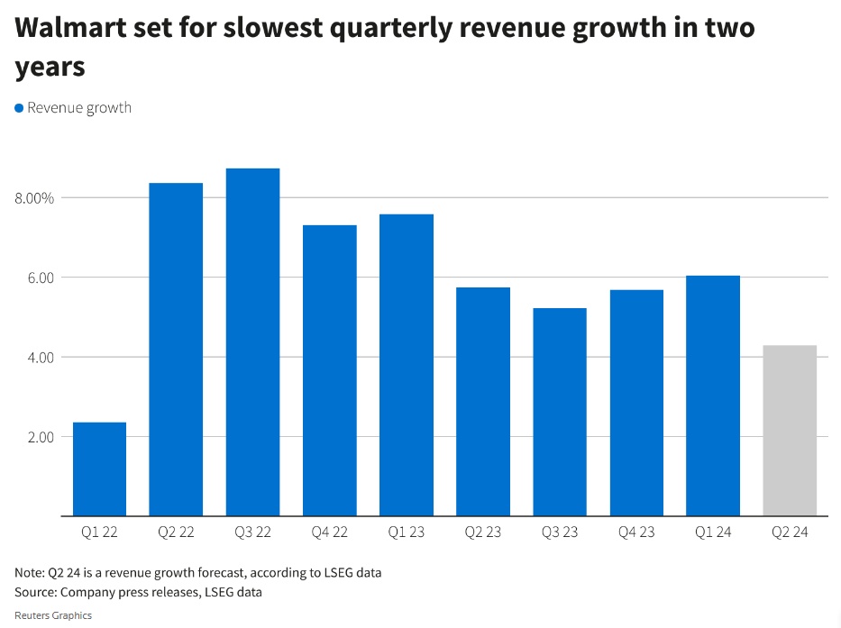 沃尔玛将于8月15日公布第二季度业绩,预计季度营收将增长4%。不过,根据LSEG的数据,这将是其近两年来最慢的增长速度。