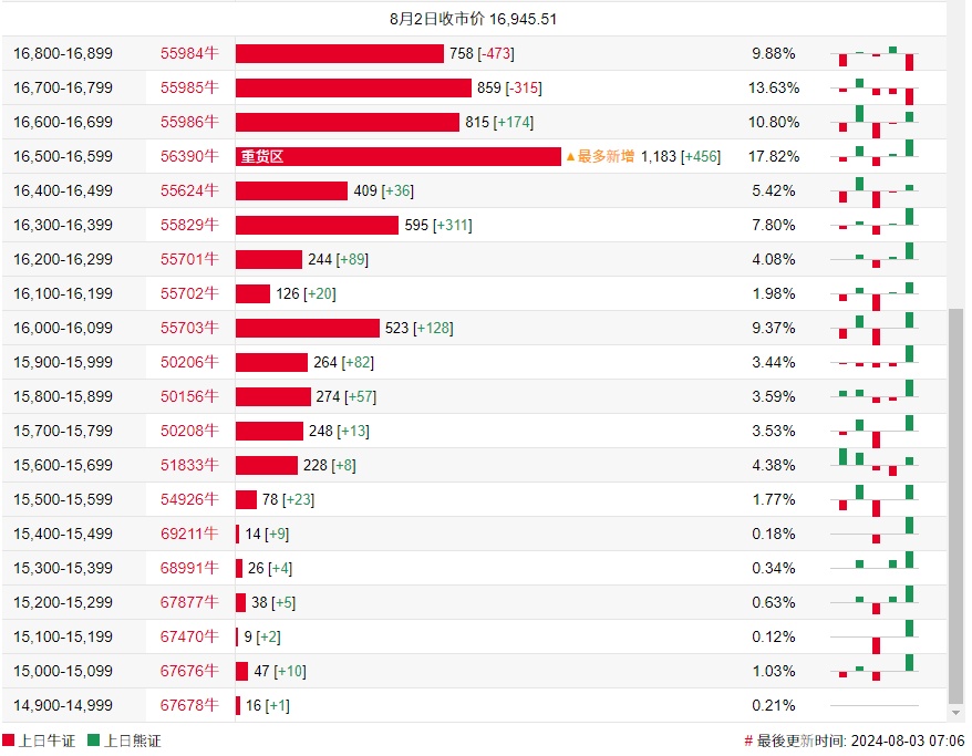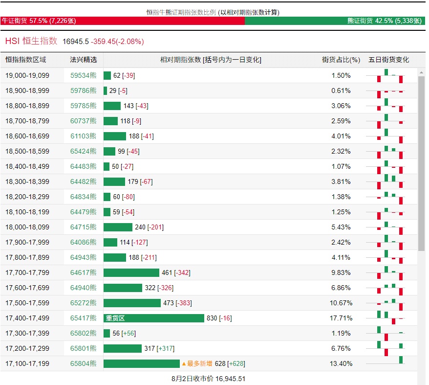 法兴恒指牛熊证街货分布图中的数据显示,熊证街货重货区在17400-17499区间,该区间最新熊证数量为830张,较上一交易日减少16张;最多新增在17100-17199区间,较上一交易日增加628张。
