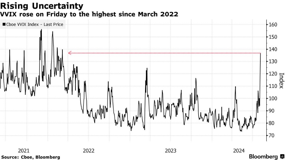同时,市场波动性正在上升。芝加哥期权交易所波动率指数(VIX)周五跃升至29.66,这是自2023年3月以来从未触及的水平。衡量VIX波动性的VVIX指数也徘徊在自2022年3月美联储加息周期开始以来的最高水平附近。