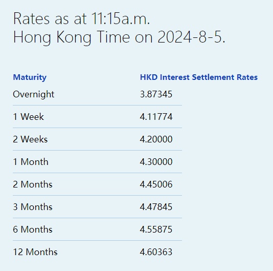 智通财经APP获悉,8月5日,港元拆息连续三日集体走低,其中,隔夜拆息再跌22基点至3.87345%,为6月18日以来最低。与楼按相关的一个月拆息连跌六天,报4.3%,创逾两个半月新低。
