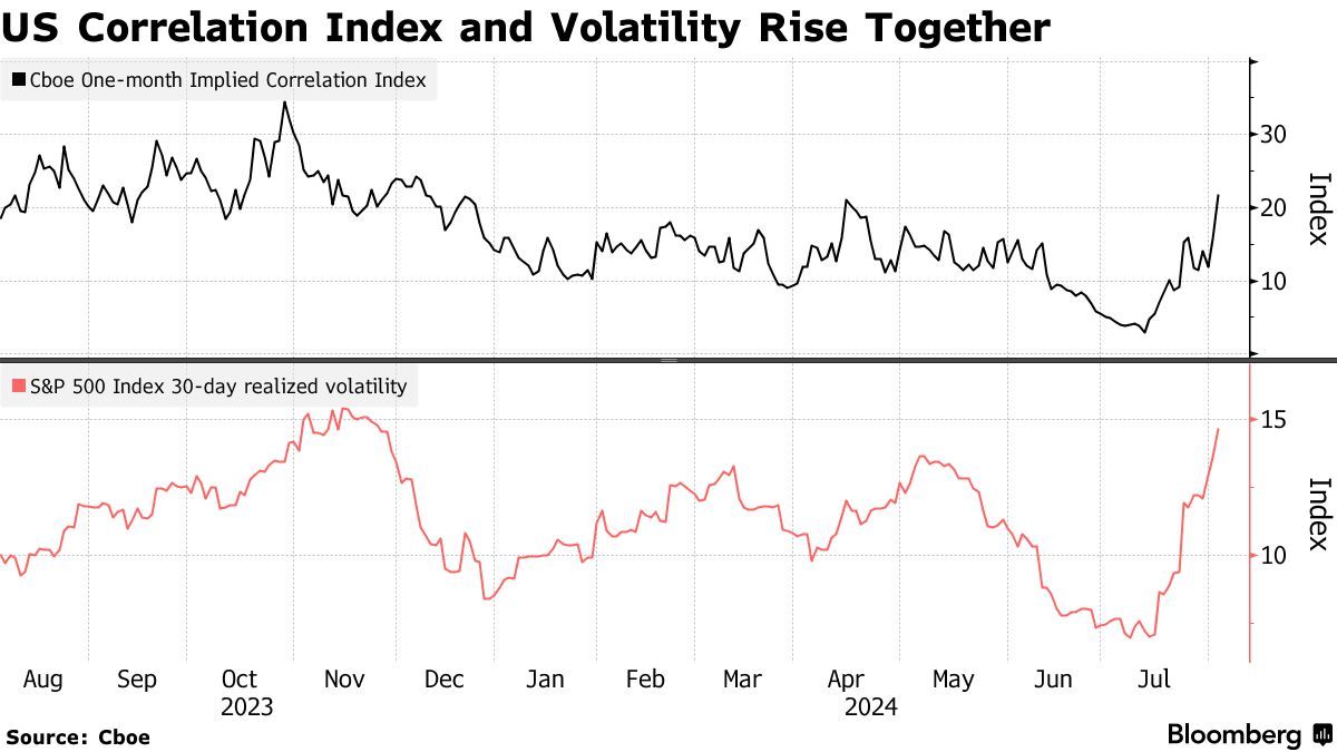 随着市场波动——无论是上涨还是下跌——扩大,已实现的波动率也在急剧攀升,自7月初以来增长了一倍多,达到自去年11月以来的最高水平。这可能会限制一些旨在限制波动性的基金的投资力度。与此同时,股票关联度从6月底的历史低点上升,当时投资者正追逐人工智能和技术巨头的反弹。