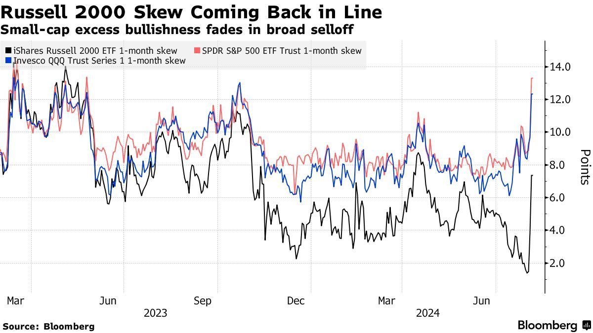 不断扩大的抛售抑制了市场人气向小盘股的转变。SPDR标普500 ETF信托基金的一个月看跌偏度为2023年6月以来最高,而追踪纳斯达克100指数的景顺QQQ信托系列1的一个月看跌偏度为去年10月以来最大。就连与其他知名ETF不同的iShares Russell 2000 ETF的看跌期权溢价也从周中低点回升。