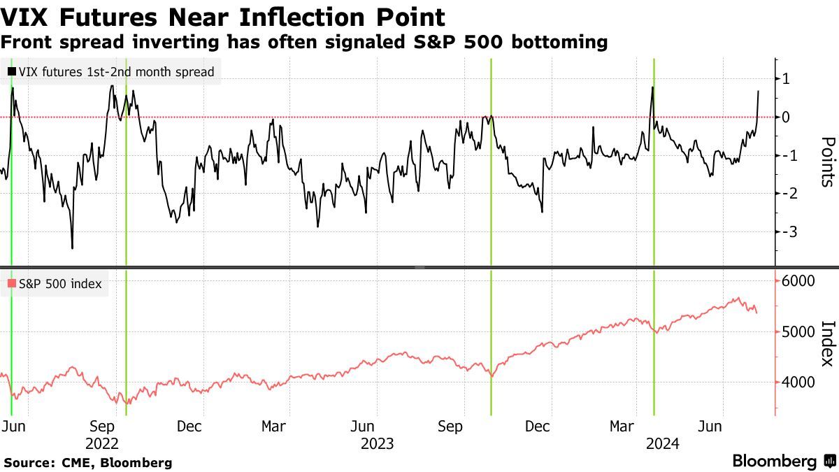 据悉,8月VIX期货合约的交易水平为24.4,高于9月VIX期货合约的23.8。过去四次近月VIX期货合约交易水平高于第二个月的情况分别出现在2022年6月和10月、2023年10月和2024年4月,而标普500指数在这期间均接近短期底部。