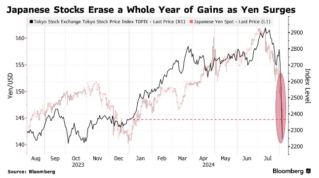 避险情绪并非全部源自日本。全球债券市场上涨导致收益率下降,这在很大程度上反映了对美国经济前景的担忧。市场越来越担心美联储在政策支持方面落后,全球投资者正在抛弃风险资产,转向避险资产。