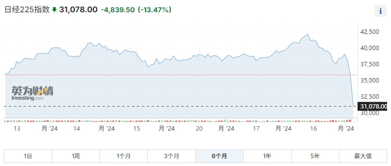 自日本央行加息以来,东证指数所有 33 个行业类别均出现下跌。该指数在上周五陷入回调,较 7 月高点下跌逾 10%。周一日经225指数下跌逾13%,下探至31000点上方,较7月11日创下的数十年高点累计下跌超20%,进入技术性熊市。