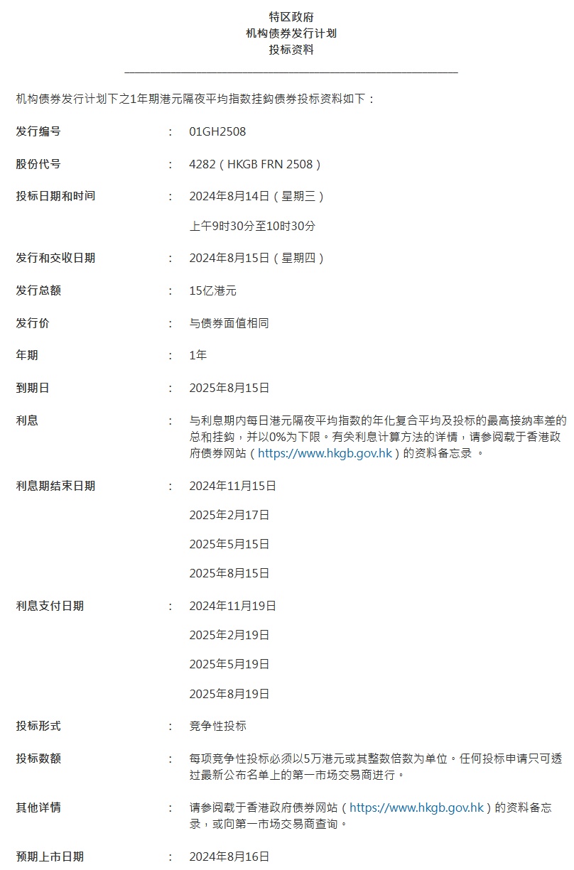 智通财经APP获悉,8月5日,香港金管局以香港特区政府代表身份公布,在机构债券发行计划下推出的1年期港元隔夜平均指数挂钩债券(债券),将于2024年8月14日(星期三)进行投标,并于2024年8月15日(星期四)交收。据悉,总值15亿港元的1年期债券供投标。该批债券将于2025年8月15日期满,利率与港元隔夜平均指数挂钩,每三个月派息一次。