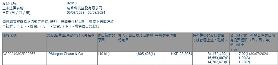 智通财经APP获悉,香港联交所最新资料显示,7月30日,小摩增持瑞声科技(02018)180.5426万股,每股作价28.3954港元,总金额约为5126.58万港元。增持后最新持股数目约为8417.24万股,最新持股比例为7.02%。