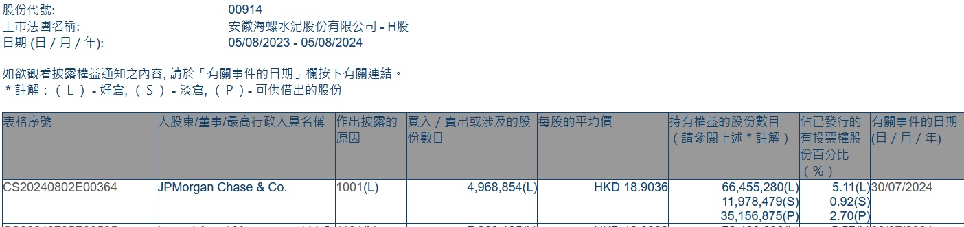 智通财经APP获悉,香港联交所最新资料显示,7月30日,摩根大通增持海螺水泥(00914)496.8854万股,每股作价18.9036港元,总金额约为9392.92万港元。增持后最新持股数目约为6645.53万股,最新持股比例为5.11%。