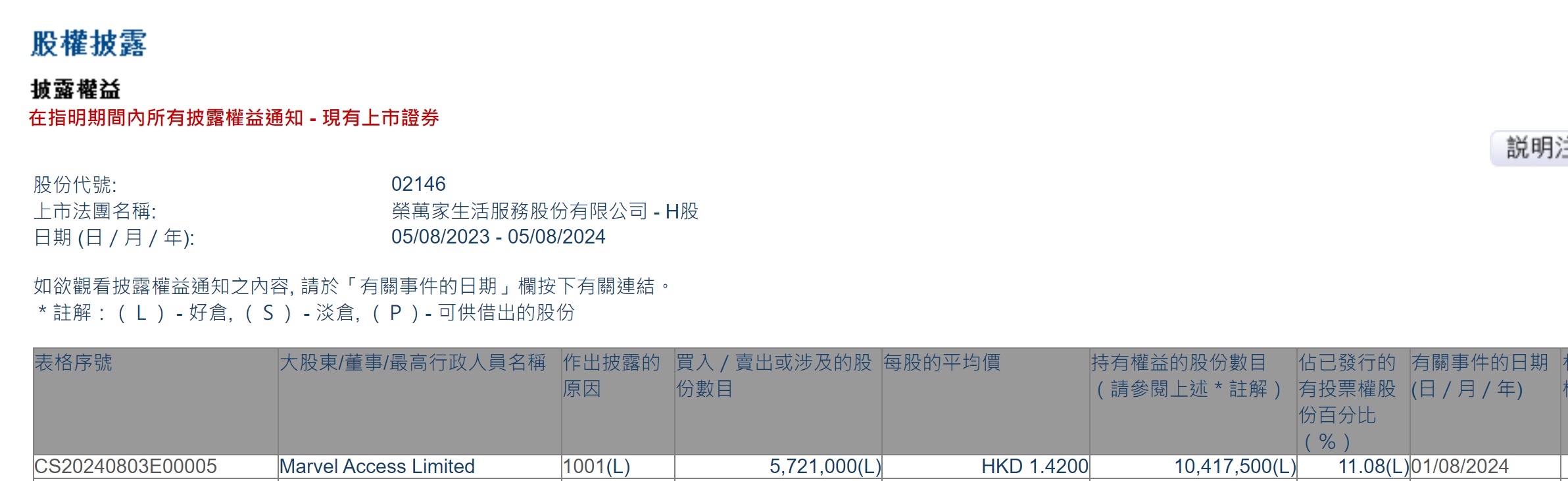 Limited增持荣万家(02146)572.1万股,每股作价1.42港元,成交额812.382万港元。增持后最新持股数目为1041.75万股,持股比例为11.08%。