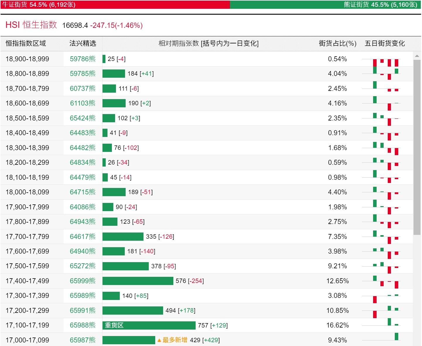 法兴恒指牛熊证街货分布图中的数据显示,熊证街货重货区在17100-17199区间,该区间最新熊证数量为757张,较上一交易日增加129张;最多新增在17000-17099区间,该区间最新熊证数量为429张,较上一交易日增加429张。