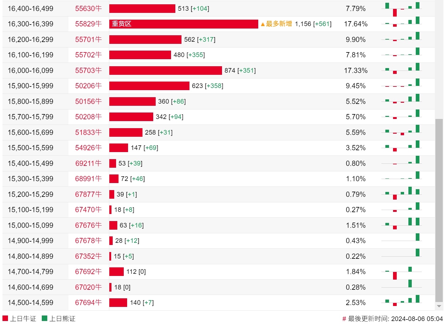 牛证街货重货区在16300-16399区间,该区间最新牛证数量为1156张,较上一交易日增加561张;最多新增在相同区间。