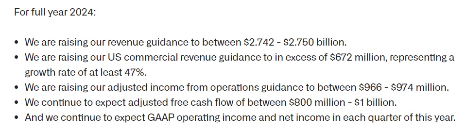 市场最为关注的业绩展望方面,Palantir将其2024年的总营收指引区间意外上调至27.4亿美元至27.5亿美元之间,根据机构汇编的数据,华尔街分析师们普遍预期在27亿美元附近。该公司还将今年的调整后营业利润展望区间大幅度上调至9.66亿美元至9.74亿美元,相比之下,分析师们普遍预期在8.83亿美元附近。