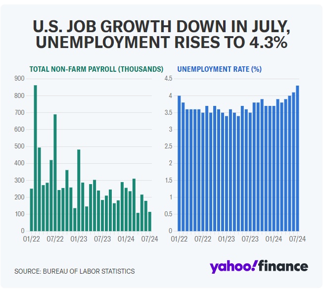 由于华尔街股票的大量抛售,加之上周五令人失望的就业报告引发的经济衰退担忧,美联储降息的压力正在增大。美国劳工统计局公布的数据显示,7月份美国经济新增非农就业岗位11.4万个,低于预期的17.5万个。失业率上升至4.3%,为2021年10月以来的最高水平。