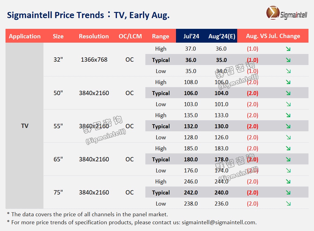 TV面板尺寸价格开始下降,预计八月维持下降趋势。