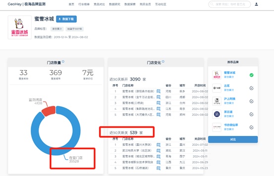 记者注意到,网传数据引自第三方机构“极海品牌监测”。8月3日下午,记者打开极海数据平台,显示蜜雪冰城近90天闭店仅为539家,与网传“90天闭店3808家”相去甚远。