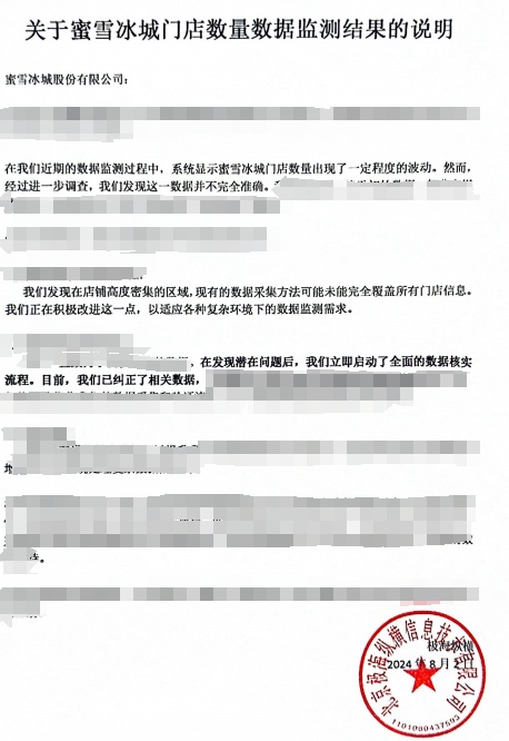 记者从一份加盖“北京极海纵横信息技术有限公司”公章的情况说明中看到,“在我们近期的数据监测过程中,系统显示蜜雪冰城门店数量出现了一定程度的波动。经过进一步调查,我们发现这一数据并不完全准确。”在这份说明中,极海纵横也解释了数据出现错误的原因,为“在店铺高度密集的区域,现有的数据采集方法可能未能完全覆盖所有门店信息。目前已纠正了相关数据”。