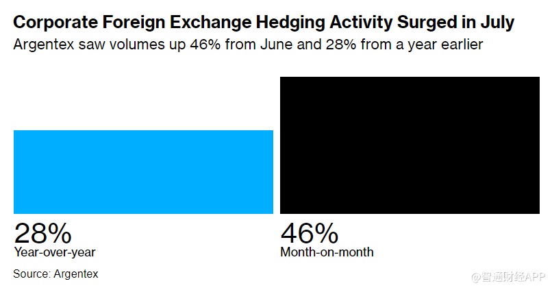 桑坦德银行英国分行表示,7月份企业外汇交易量较上年同期增长21%。汇率风险管理公司Argentex Group Plc表示,7月是今年企业对冲交易最繁忙的月份,巴克莱银行报告称,企业对冲活动“显著”增加。