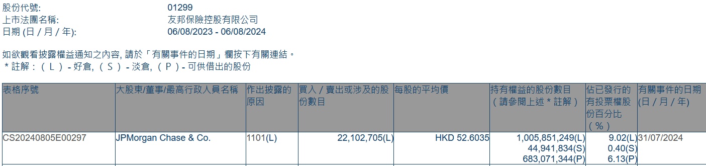 智通财经APP获悉,香港联交所数据显示,7月31日,小摩增持友邦保险(01299)2210.2705万股,每股作价52.6035港元,总金额约为11.63亿港元。增持后最新持股数目约为10.06亿股,持股比例为9.02%。