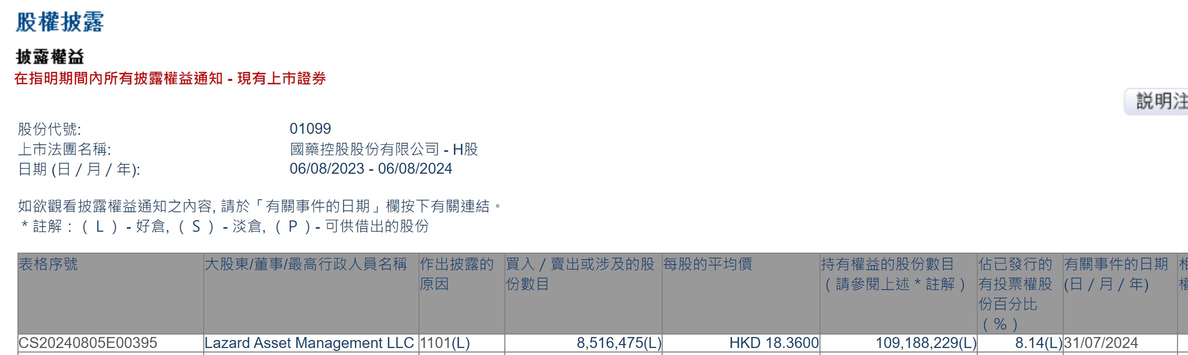 LLC增持国药控股(01099)851.6475万股,每股作价18.36港元,总金额约为1.56亿港元。增持后最新持股数目约为1.09亿股,最新持股比例为8.14%。