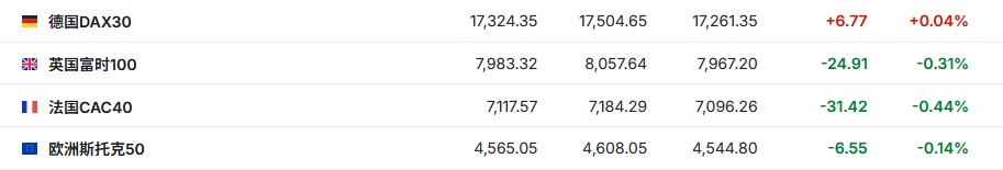 2. 截至发稿,德国DAX指数涨0.04%,英国富时100指数跌0.31%,法国CAC40指数跌0.44%,欧洲斯托克50指数跌0.14%。
