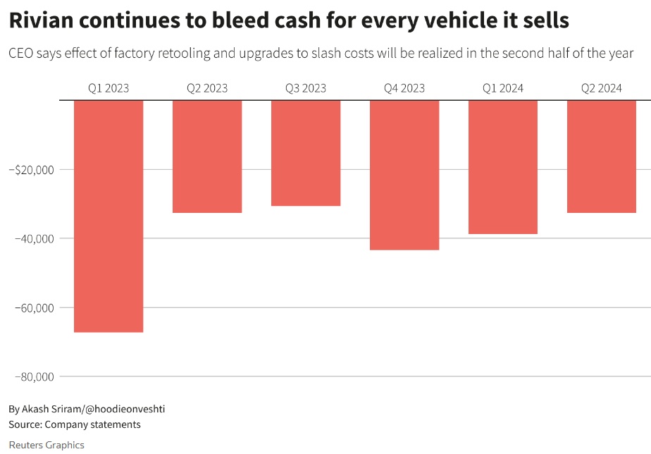 今年上半年,Rivian生产了约23600辆汽车,其中第二季度仅生产了9162辆,原因是该公司的工厂停工,以进行设备重组和降低成本。