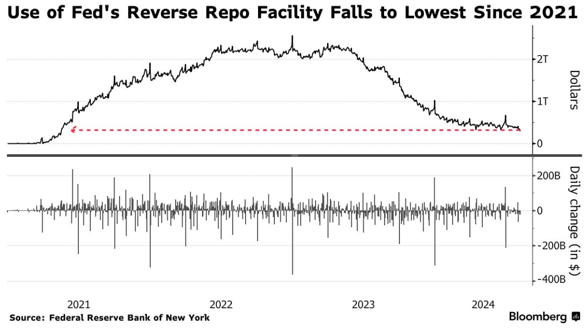 从 2023 年 6 月政府暂停债务上限到今年 4 月,美联储工具需求下降了约 1.8 万亿美元,原因是大量票据供应。当时,华尔街策略师预计RRP 将在 2024 年上半年完全耗尽。