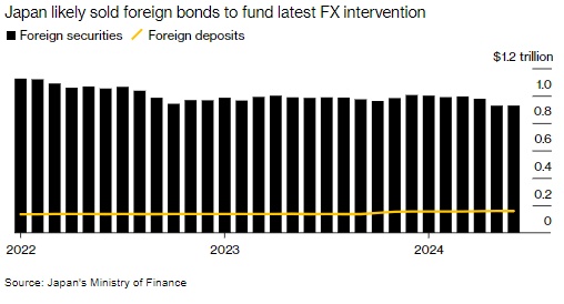 外国证券持有量的减少暗示日本政府可能再次出售美国国债,以此为汇率干预筹集资金。今年4月和5月,日本政府也曾采取类似行动,当时花费了创纪录的9.8万亿日元来支持日元。