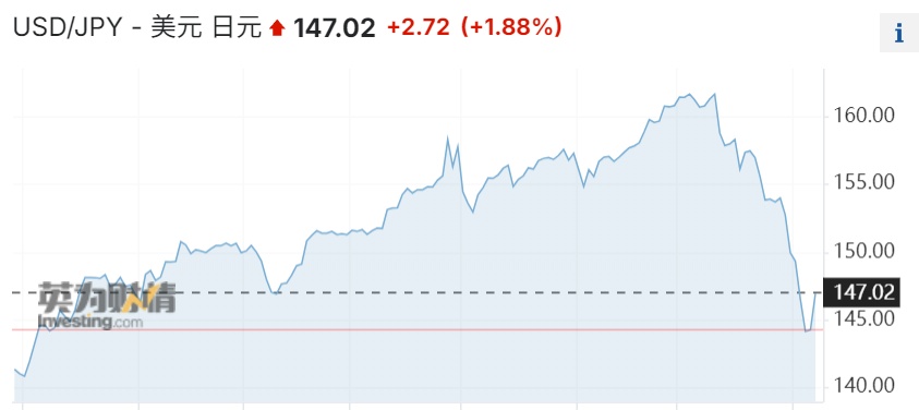 由于日本央行上周加息后日本市场持续波动,日元兑美元汇率下跌逾 2%,截至发稿,日元兑美元汇率下跌,至1美元兑147.02。