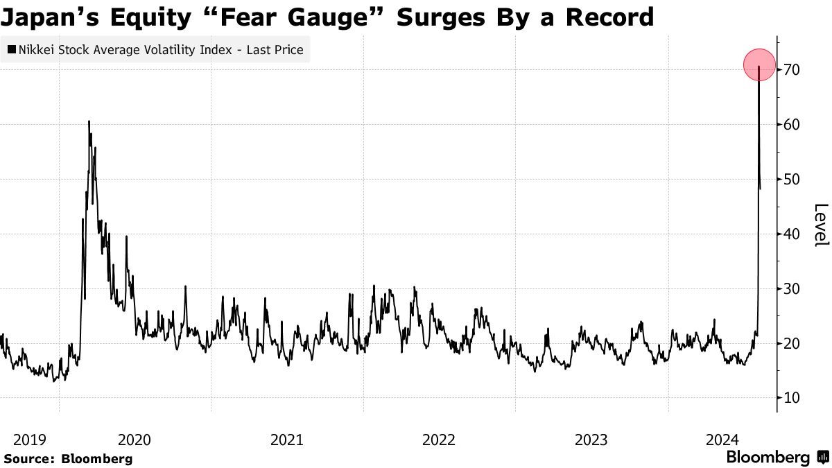 分析师表示,市场最初的历史性抛售表明,任何希望从日元疲软和日本股市普遍上涨中获利的动能交易都已被抹去。日元的飙升也破坏了今年最赚钱的市场策略之一——套利交易,即借入较低利率的日元(在利率长期处于最低水平的情况下,借入日元几乎是免费的)并投资于高收益资产。日元的快速反弹引发了对这类套利交易的平仓,平仓的同时会带来进一步的日元升值压力,进而带来更多的日元平仓,从而循环往复。