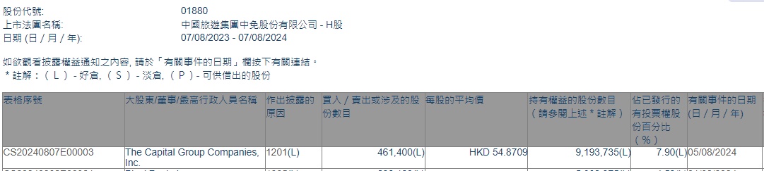 智通财经APP获悉,香港联交所最新资料显示,8月5日,美国资本集团减持中国中免(01880)46.14万股,每股作价54.8709港元,总金额约为2531.74万港元。减持后最新持股数目约为919.37万股,最新持股比例为7.9%。