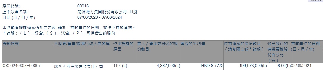 智通财经APP获悉,香港联交所最新资料显示,8月2日,瑞众人寿保险有限责任公司增持龙源电力(00916)486.7万股,每股作价6.7772港元,总金额约3298.46万港元。增持后最新持股数目约为1.99亿股,持股比例为6%。