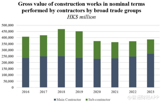 自疫情后管控措施放开后,香港建筑行业有所回暖,并于2023年保持相对稳定增长。就2023年整体而言,主要承建商所完成的建造工程名义总值的总计为2710亿港元,同比上升8.8%;剔除价格变动的影响后,以实质计算,主要承建商在2023年所完成的建造工程总值的总计同比上升9.9%。