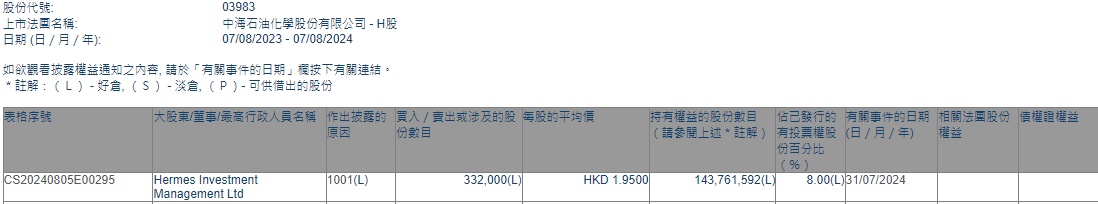 Ltd增持中海石油化学(03983)33.2万股,每股作价1.95港元,总金额为64.74万港元。增持后最新持股数目约为1.44亿股,最新持股比例为8%。