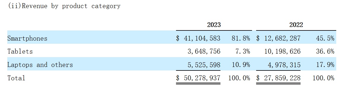 从产品类别上看,创智环球的批发业务的收入主要来源于智能手机,2023财年时来自智能手机的收入占比为81.8%,其次是笔记本电脑及其他占比10.9%,平板电脑占比7.3%。收入来自于智能手机的占比较2022年时显著提升,2022年时为45.5%。