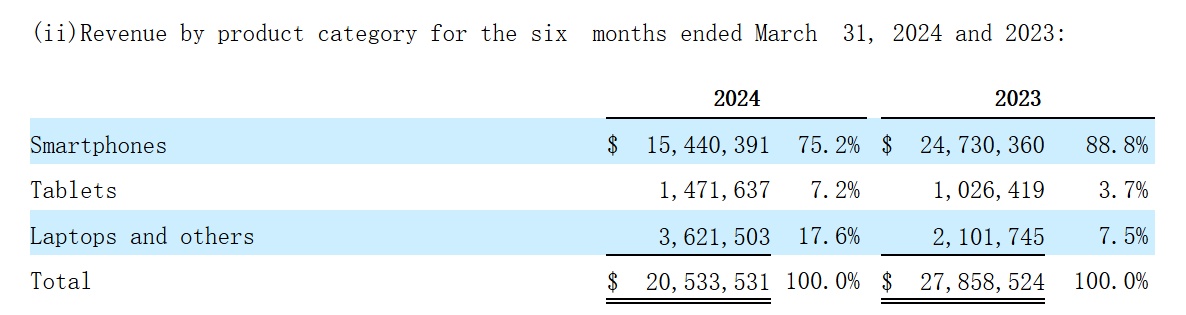 进入2024财年上半年(截至3月31日止6个月),为改变2023财年时“增收不增利”的局面,创智科技战略性的选择了利润较高的订单,这使得来自智能手机的收入出现了明显下滑,从而拖累公司总收入下降26.3%至2053.35万美元。