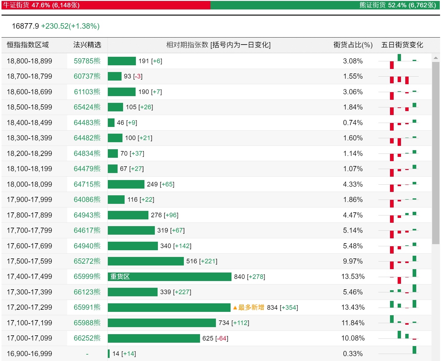 法兴恒指牛熊证街货分布图中的数据显示,熊证街货重货区在17400-17499区间,该区间最新熊证数量为840张,较上一交易日增加278张;最多新增在17200-17299区间,该区间最新熊证数量为834张,较上一交易日增加354张。