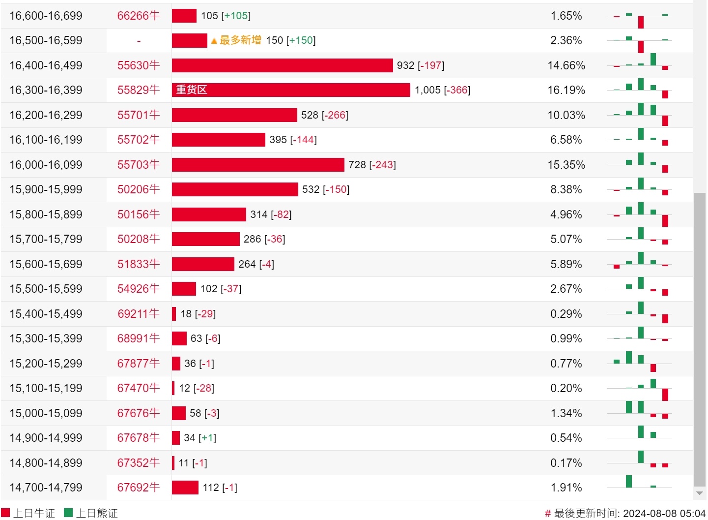 牛证街货重货区在16300-16399区间,该区间最新牛证数量为1005张,较上一交易日减少366张;最多新增在16500-16599区间,该区间最新牛证数量为150张,较上一交易日增加150张。