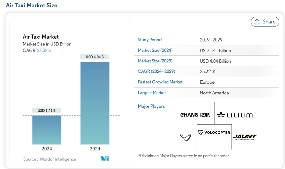 知名研究机构Mordor Intelligence预测报告显示,2024年空中出租车市场规模预计约为14.1亿美元,预计到2029年将达到大约40.4亿美元,在预测期(2024-2029年)之内的复合年增长率高达23%。