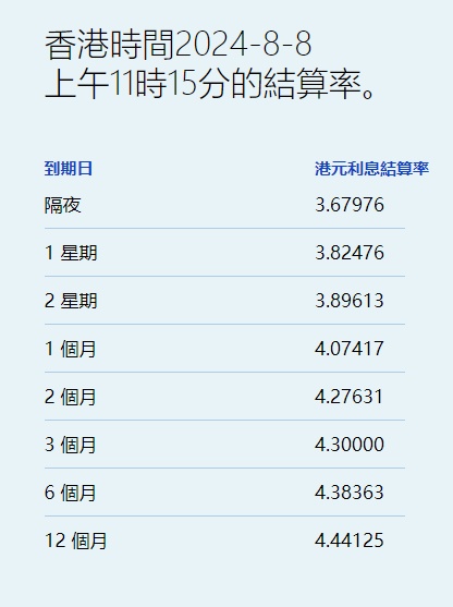 智通财经APP获悉,8月8日,港元拆息连续两天全线向下,隔夜息再跌近10基点至3.67976%,见逾两个月最低,而与楼按相关的一个月拆息亦连跌九天,报4.07417%,续创4月25日以来新低。