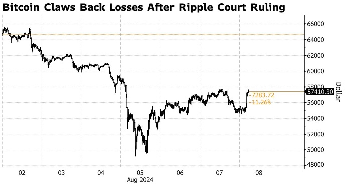 智通财经获悉,在区块链支付科技公司Ripple Labs Inc.被责令支付1.25亿美元的罚款后,主要加密货币在周四上涨,该公司将这一结果称为对美国证券交易委员会(SEC)的胜利,SEC曾要求其缴纳近20亿美元罚款。截至发稿,比特币涨幅高达4.5%,至5.76万美元以上,而第二大代币以太坊一度上涨近5%。这两种代币仍远低于一周前的水平,周一的跌幅是自2022年FTX暴雷以来的最大跌幅。裁决后,XRP代币上涨了25%。