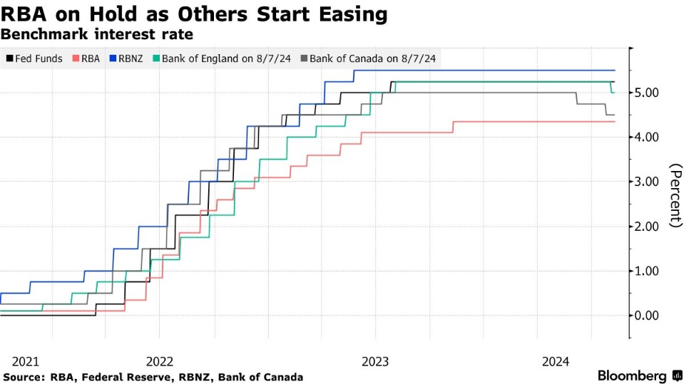 与此同时,澳大利亚央行在全球央行中相对落后,许多其他央行已经开始或计划放松政策以控制通胀。然而,澳大利亚的通胀率(以基础消费者价格指数,即CPI来衡量)预计将在2025年末才能回落至澳大利亚央行设定的2-3%的目标区间。目前,澳大利亚第二季度CPI为3.9%。