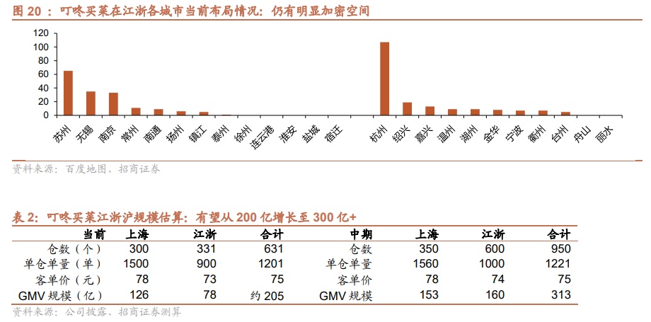 另就市场空间来看,目前叮咚买菜在杭州的前置仓数量刚过百,而苏州、南京、无锡等城市约为50个上下,对比上海单个城市300仓的密度,江浙仍有较大的加密空间。根据招商证券分析师测算,若后续叮咚买菜在江浙仓数达到600+,且单量稳定在当前1000单/仓/天的水平,再叠加上海仓数的适度加密以及单仓单量的适度提升,那么公司在江浙沪市场的规模有望达到300亿元。