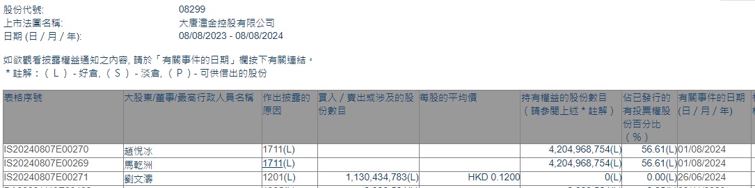 刘文涛减持大唐潼金(08299)11.304亿股 每股作价0.12港元