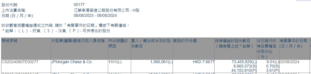 智通财经APP获悉,香港联交所最新资料显示,8月2日,小摩增持江苏宁沪高速公路(00177)156.6061万股,每股作价7.6677港元,总金额约为1200.81万港元。增持后最新持股数目约为7345.58万股,最新持股比例为6.01%。