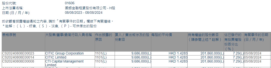 智通财经APP获悉,香港联交所最新资料显示,8月5日,CITIC Limited增持国银金租(01606)968.6万股,每股作价1.4283港元,总金额约为1383.45万港元。增持后最新持股数目约为2.02亿股,最新持股比例为7.29%。