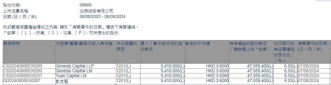 智通财经APP获悉,香港联交所最新资料显示,8月7日,彭志坚减持北森控股(09669)941万股,每股作价3.6港元,总金额约3387.6万港元。减持后最新持股数目约为4705.94万股,持股比例为6.53%。