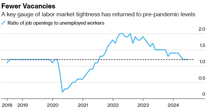 但当美联储在2022年和2023年大举加息以抑制物价上涨时,引发了经济的一些降温,但雇主们的反应并不像预期的那样。此前,虽然职位空缺慢慢减少,但由于裁员很少,失业率仍然很低。现在,每位失业者对应每个职位空缺的比例降至1:1,与2019年的水平一致,官员们警告说,需求疲软可能会导致失业率上升。