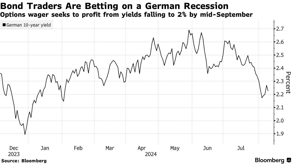 美国上周公布的疲软的就业数据引发了人们对经济增长放缓可能蔓延至全球的担忧,避险情绪提振下对债券的需求有所增长。本周一,十年期德国国债收益率跌至2.08%,创下6月中旬以来的最大跌幅。