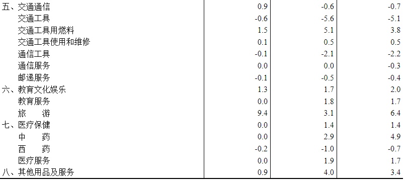 其他七大类价格同比六涨一降。其中,其他用品及服务、教育文化娱乐价格分别上涨4.0%和1.7%,衣着、医疗保健价格分别上涨1.5%和1.4%,生活用品及服务、居住价格分别上涨0.7%和0.1%;交通通信价格下降0.6%。
